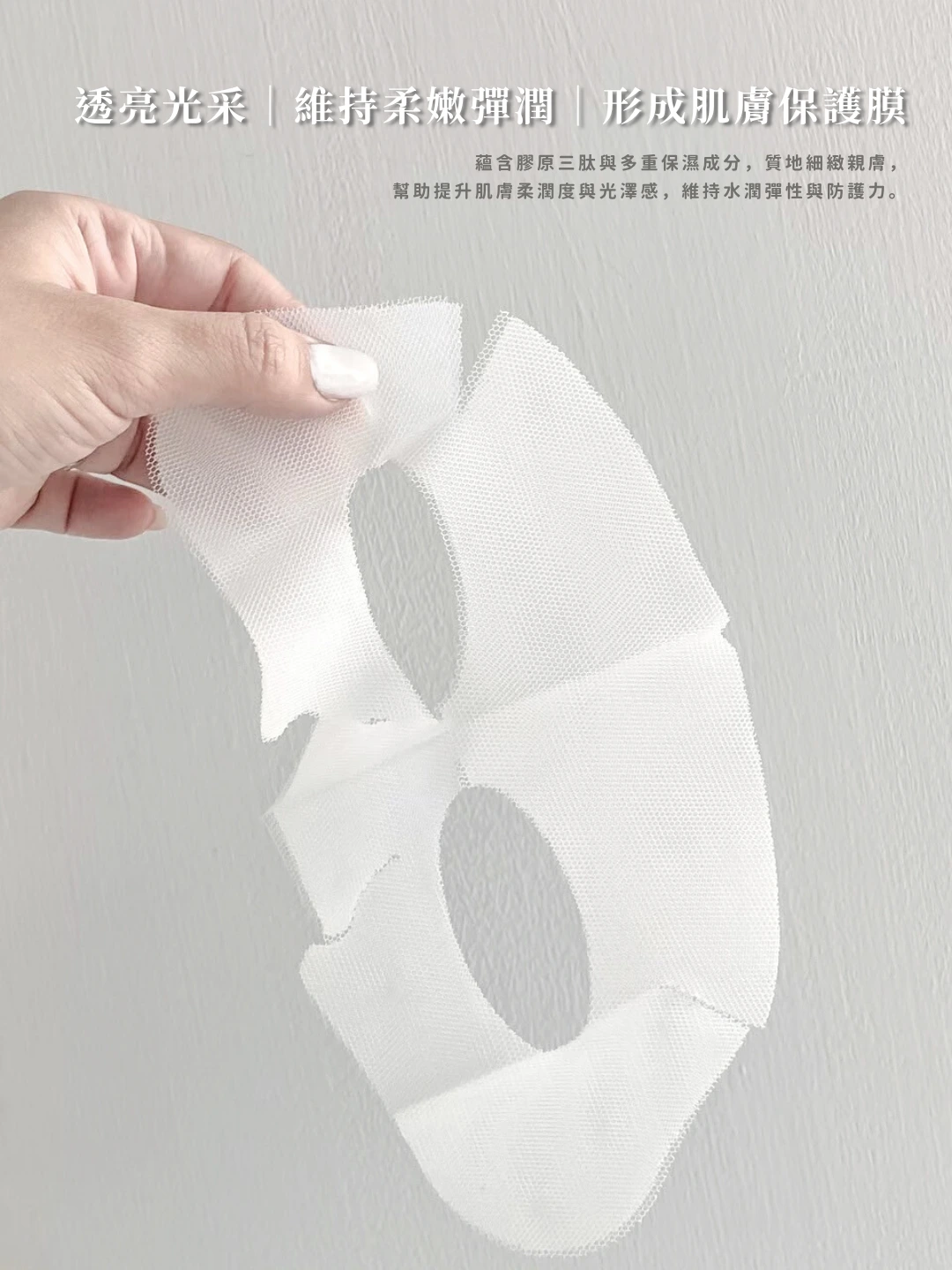 按壓至精華吸收後取下面膜,肌膚呈現水潤光澤狀態。