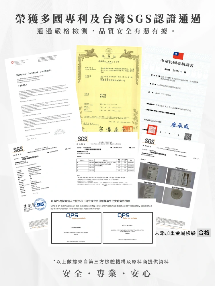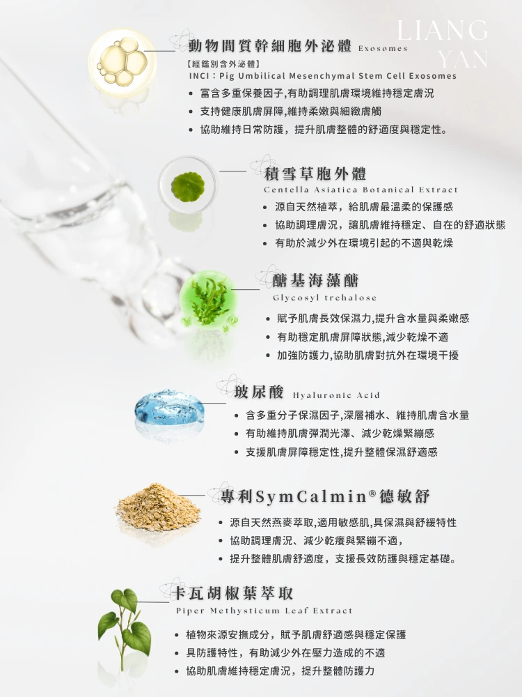 主要成分:動物間質幹細胞外泌體、積雪草植物胞外體、醣基海藻醣、卡瓦胡椒萃取、透明質酸鈉