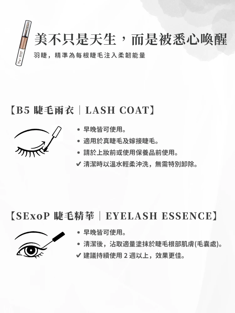 【用途】溫和調理睫毛環境,補充日常所需的滋潤與保護。