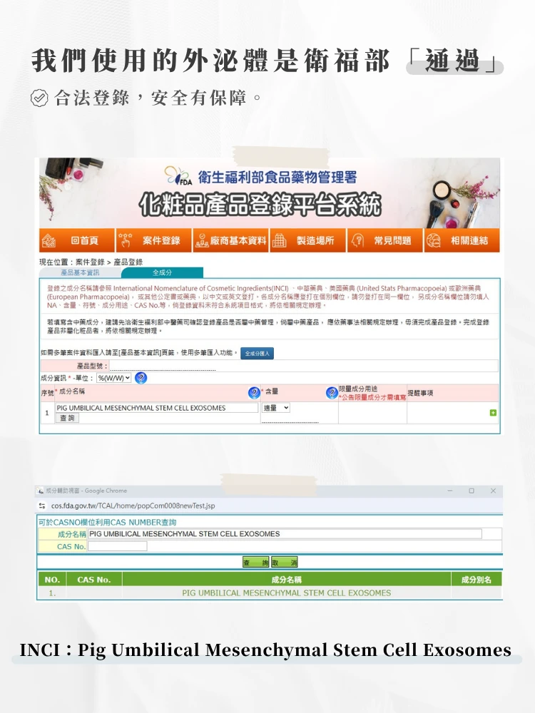 D-Panthenol維他命原B5、外泌體 (豬臍帶間質幹細胞外泌體)、Polygonum Multiflorum何首烏植物胞外體,Sodium Hyaluronate透明質酸鈉、Palmitoyl Pentapeptide-4 五胜肽